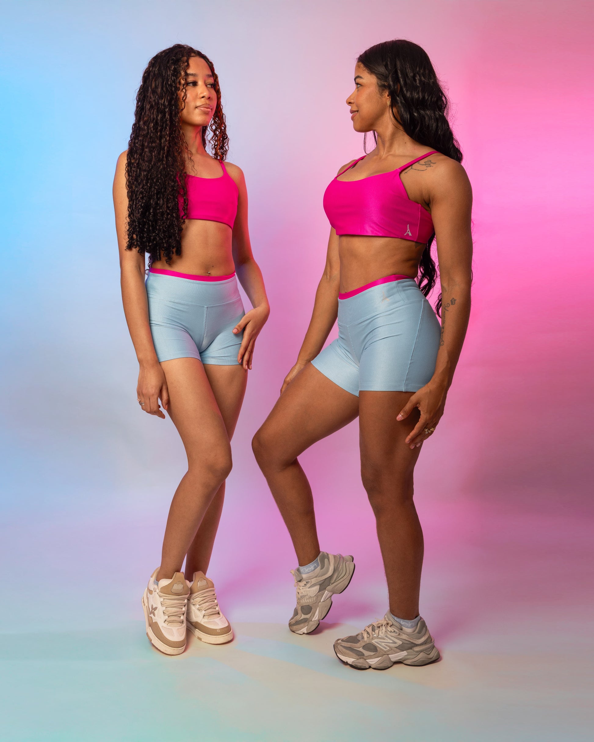 Cet ensemble dynamique, composé d’un cropped rose à bretelles fines et d’un short bleu taille haute, allie style, performance et confort.